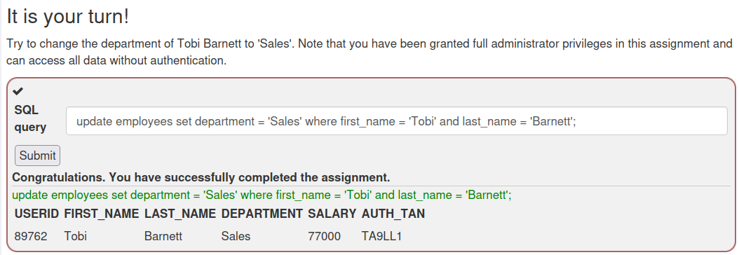 update employees set department = 'Sales' where first_name = 'Tobi' and last_name = 'Barnett';