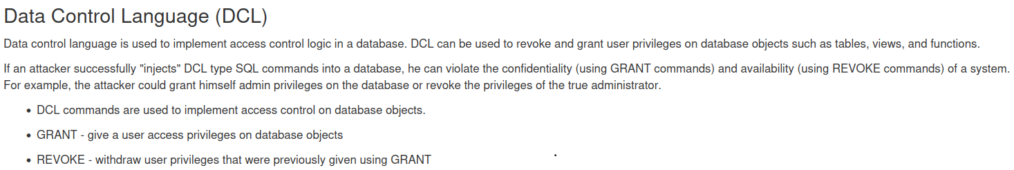 이 부분은 WebGoat가 기본적으로 HSqlDB를 사용하고 있어 발생하는 이슈로, HSqlDB는 grant나 revoke를 할때 db명 없이 바로 테이블명을 넣어 권한을 제어할 수 있다