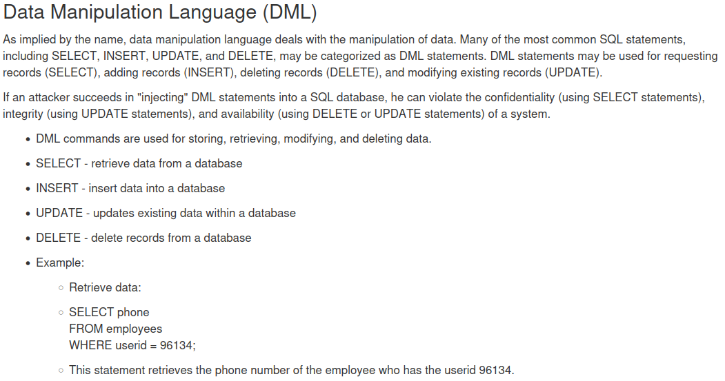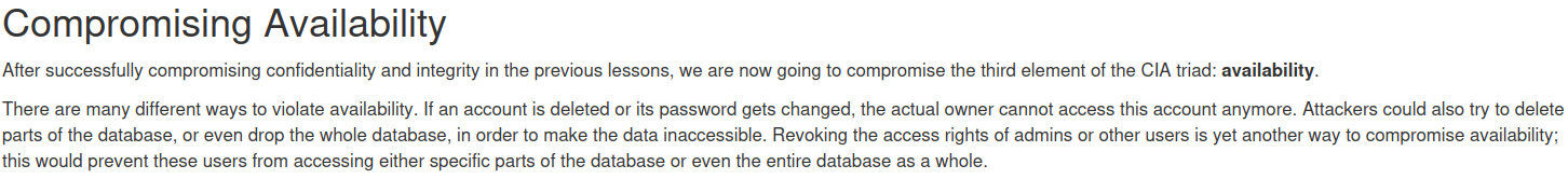 보안의 3요소인 기밀성,무결성,가용성을 SQL Injection으로 해칠 수 있다는 말이다. 내용은 앞에서 다룬 공격과 동일하다.