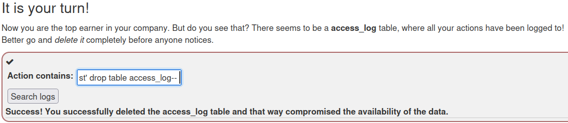 지금까지의 나의 입력이 모두 access_log 테이블에 기록되었으니 이 흔적을 지워야한다. delete는 먹히지 않으니 그냥 table 자체를 drop한다.