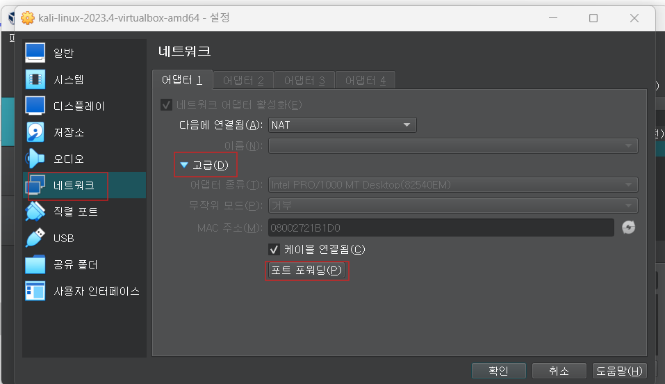 머신 > 설정에 들어가서 네트워크 > 고급 > 포트 포워딩 클릭