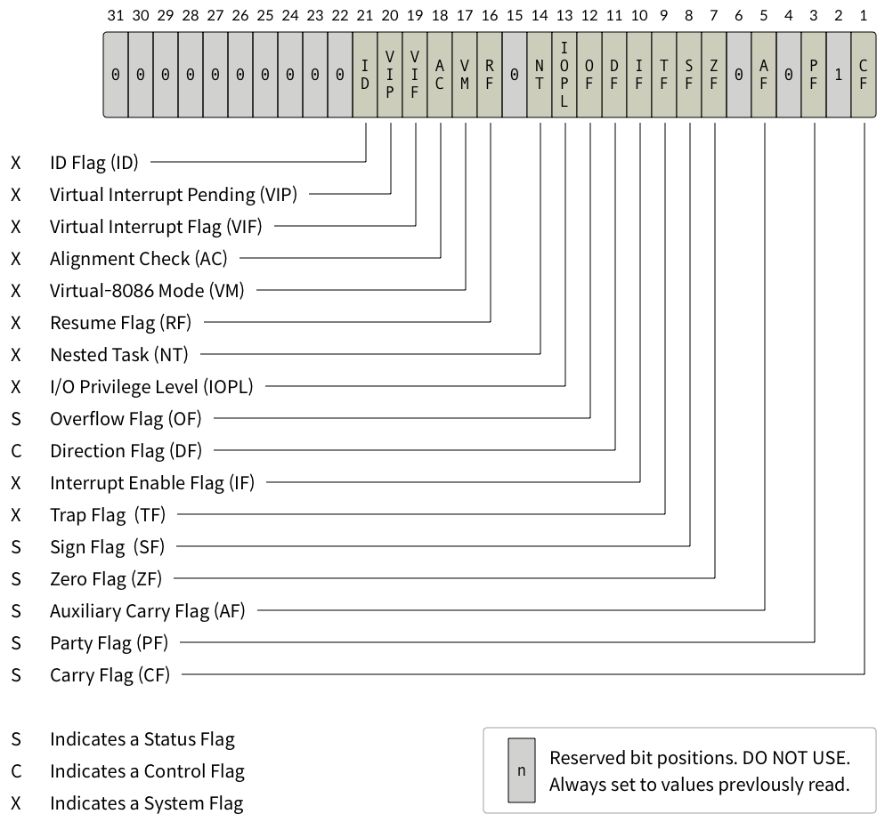 RFLAGS는 64비트이므로 최대 64개의 플래그를 사용할 수 있지만, 실제로는 아래 20여개의 비트만 사용한다. 그 중에서도 주로 접하게 될 것은 아래의 표와 같다.
