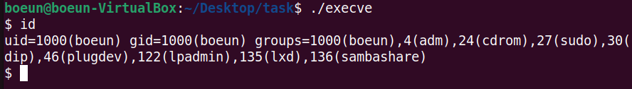 - syscall: execve("/bin/sh", NULL, NULL) 시스템 호출을 실행해 새로운 셸을 실행하게 됨