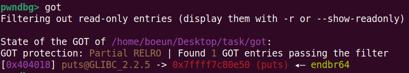 따라서 만약 앞의 예에서 puts의 GOT 엔트리에 저장된 값을 공격자가 임의로 변경할 수 있으면, puts가 호출될 때 공격자가 원하는 코드가 실행되게 할 수 있다.