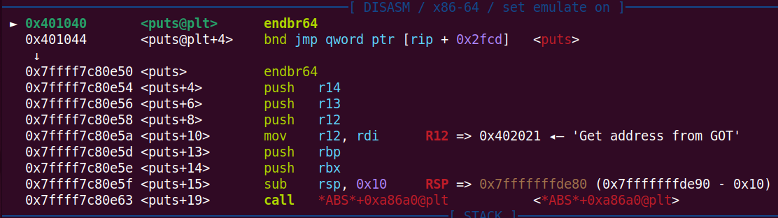 0x7ffff7e02ee3 <puts+19> call *ABS*+0xa8720@plt <*ABS*+0xa8720@plt>