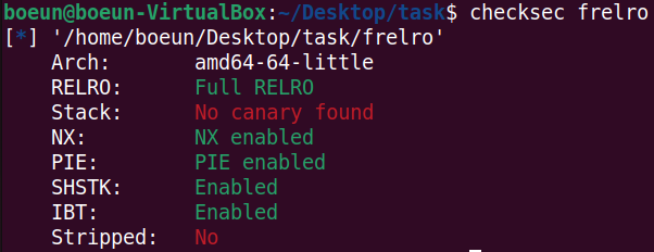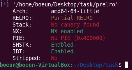 실습 환경의 gcc는 Full RELRO를 기본 적용하며, PIE를 해제하려면 Partial RELRO를 적용한다. 바이너리의 RELRO 여부도 checksec으로 검사할 수 있다.