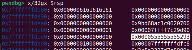 이제 RSP를 출력해보면, 다음과 같이 RSP+0x48 위치에 0x555555555293 가 저장되어 있다.(강의랑 실습이랑 조금 다름)