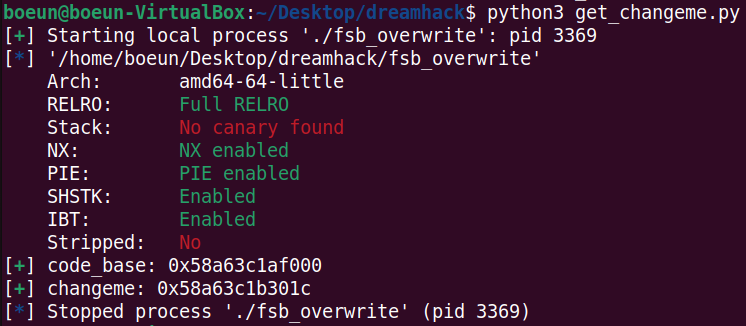 changeme의 값을 조작하려면 해당 변수의 주소를 먼저 알아내야 한다. 바이너리에는 PIE 보호 기법이 적용되어 있으므로, 전역변수인 changeme의 주소는 실행할 때마다 바뀐다. 따라서 PIE 베이스 주소를 먼저 구하고, 그 주소를 기준으로 changeme의 주소를 계산해야한다.